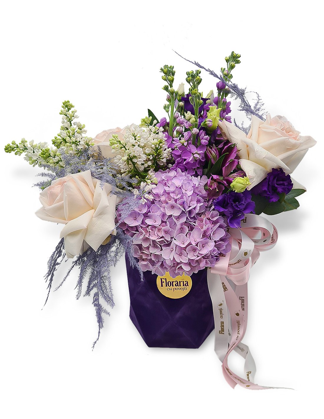 Acest aranjament floral exprimă o eleganță subtilă și o frumusețe calmă, prin folosirea unei palete de culori delicate și florilor alese cu grijă. Combinarea nuanțelor pastelate de roz și violet cu verdele proaspăt al frunzelor sugerează un sentiment de rafinament și grandoare liniștită. Prezența florilor de hortensie dă volum și o textură bogată, în timp ce trandafirii pal aduc o notă clasică de romantism, iar liliacul alb încununează ansamblul cu o mireasmă de neuitat.