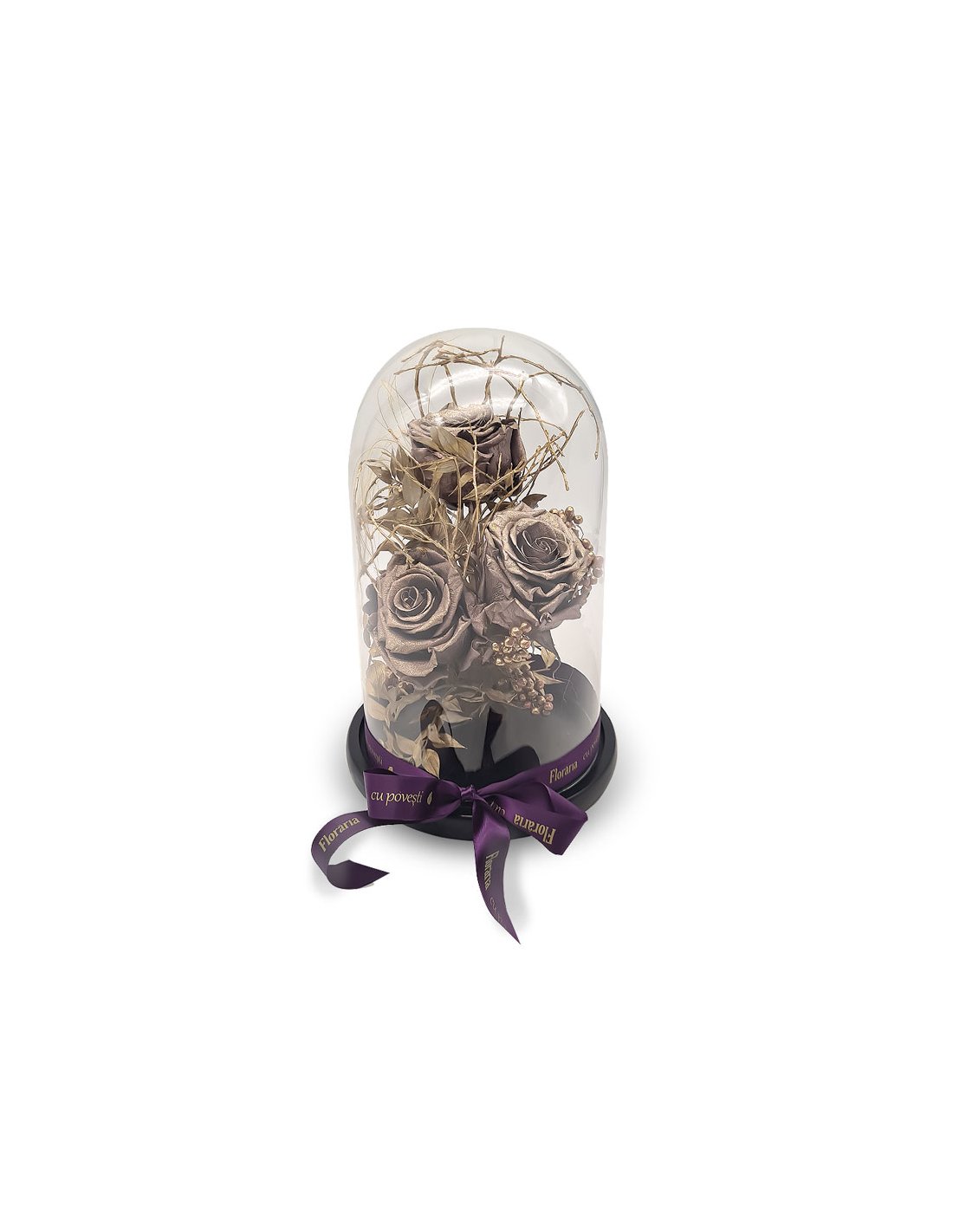 Un aranjament elegant și misterios. Trandafiri nemuritori aurii in clopot de sticlă, ce exprima o eleganta atemporala, iar clopotul de sticla adaugă un aspect de conservare și durabilitate, sugerand că sentimentele pe care le reprezintă sunt menite să dureze.