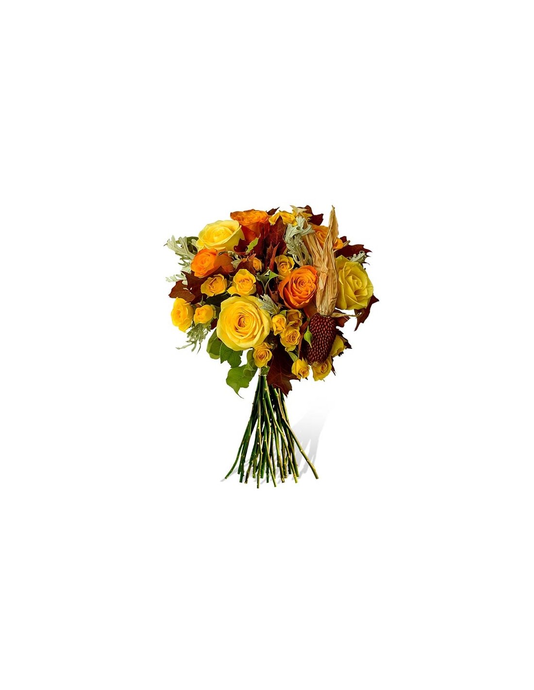 Buchet in culori calde de toamnă, cu trandafiri galbeni și portocalii, miniroze galbene, porumb și frunze arămii. Comanda acest buchet si transmite ganduri de prietenie și bucurie cu orice ocazie!