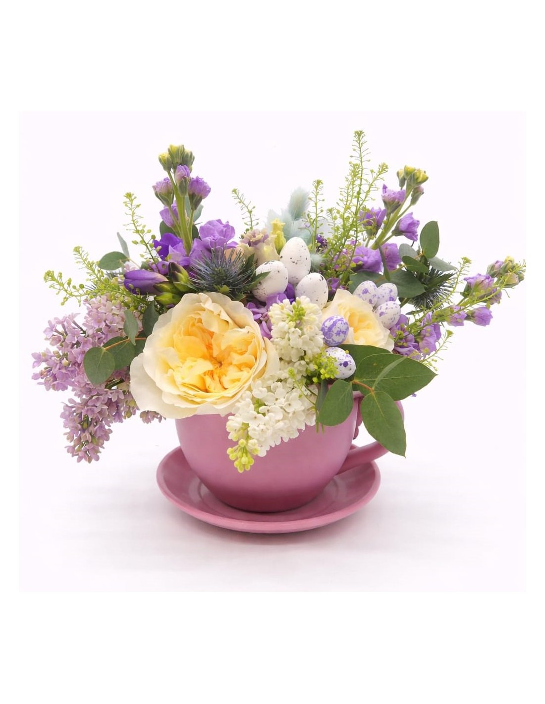 Un aranjament cu decoratiuni specifice sarbatorii de Pasti, in culori vesele, montat intr-o ceasca supradimensionata, din ceramica.