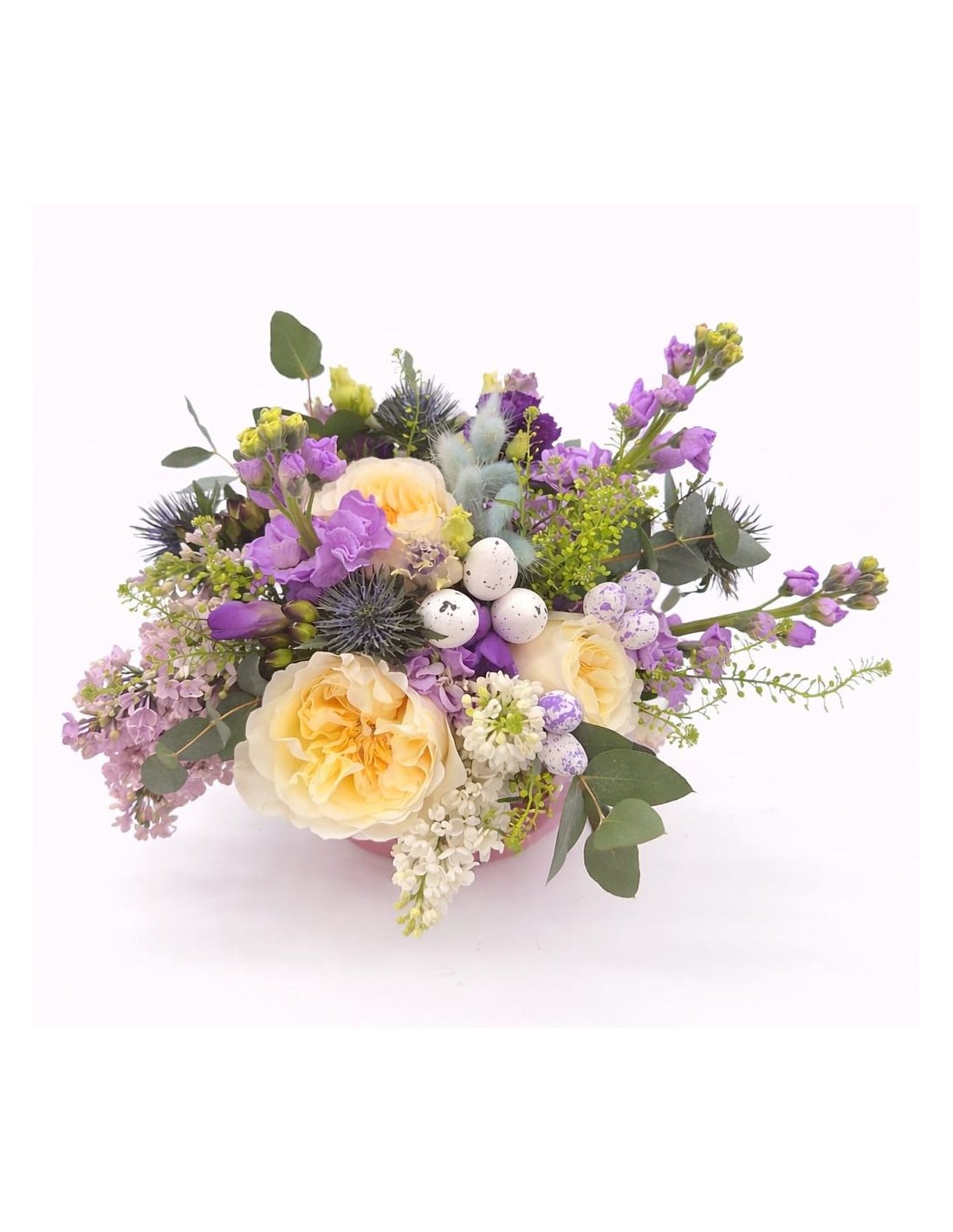 Notă: Florile pot varia ușor în funcție de sezonalitate, păstrând cromatica și stilul aranjamentului.