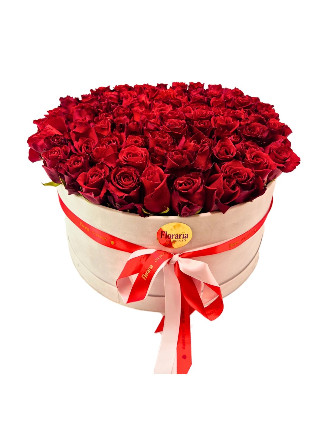 Cutie catifea, lucrata manual cu 151 trandafiri rosii!, un cadou extrem de elegant ce transmite apreciere, admiratie sau iubire. Aranjamentele sunt executate cu mare grija la detalii, din trandafiri de calitate premium, selectati unul cate unul.