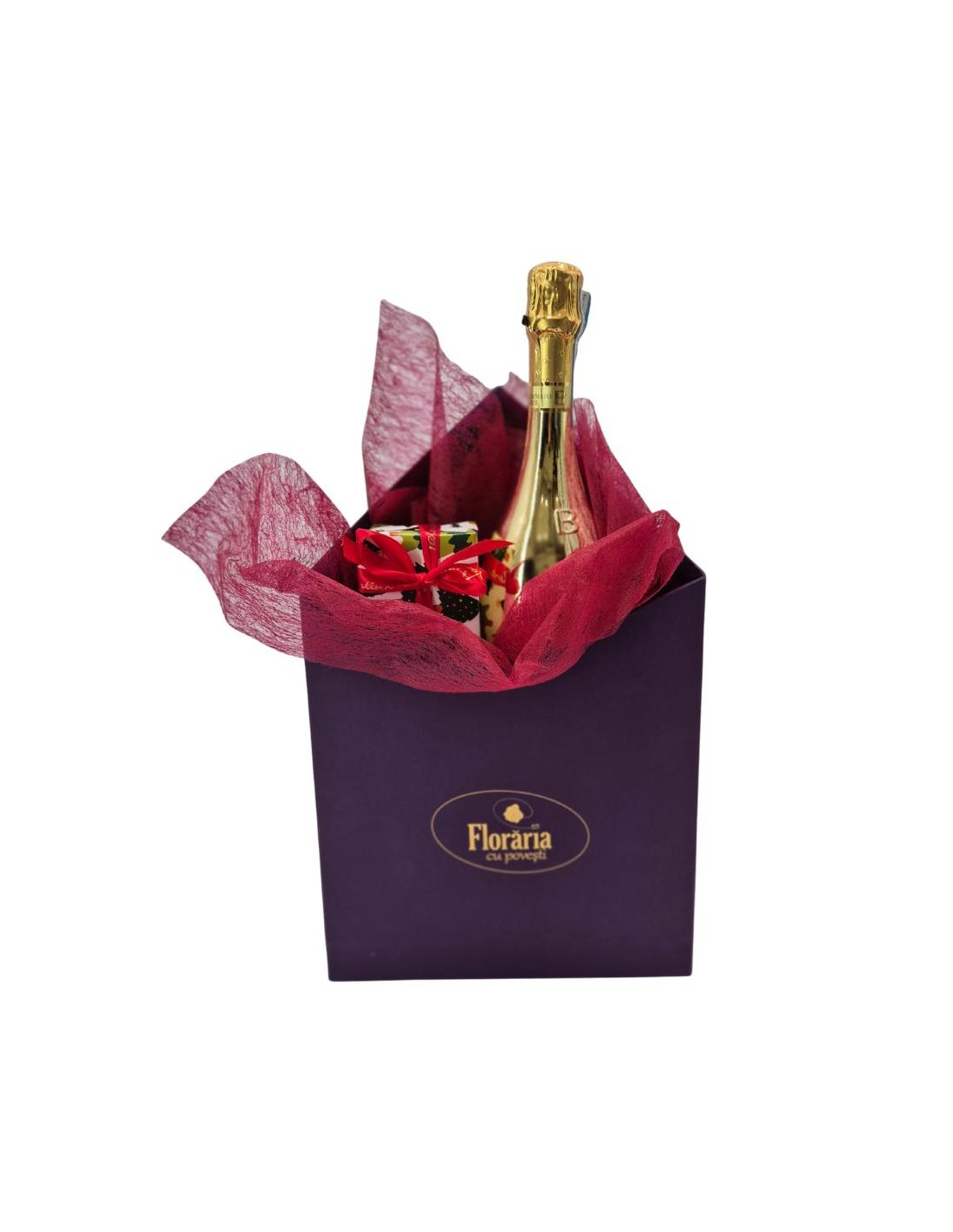 Contine o sticla de prosseco autentic si exclusivist -Bottega Gold asortat cu praline belgiene Balotin ambalate elegant intr-o cutie triunghiulara lucrata manual. Pentru o nota eleganta le-am ambalat intr-un material rosu -grena adaugand volum si textura acestui cadou.