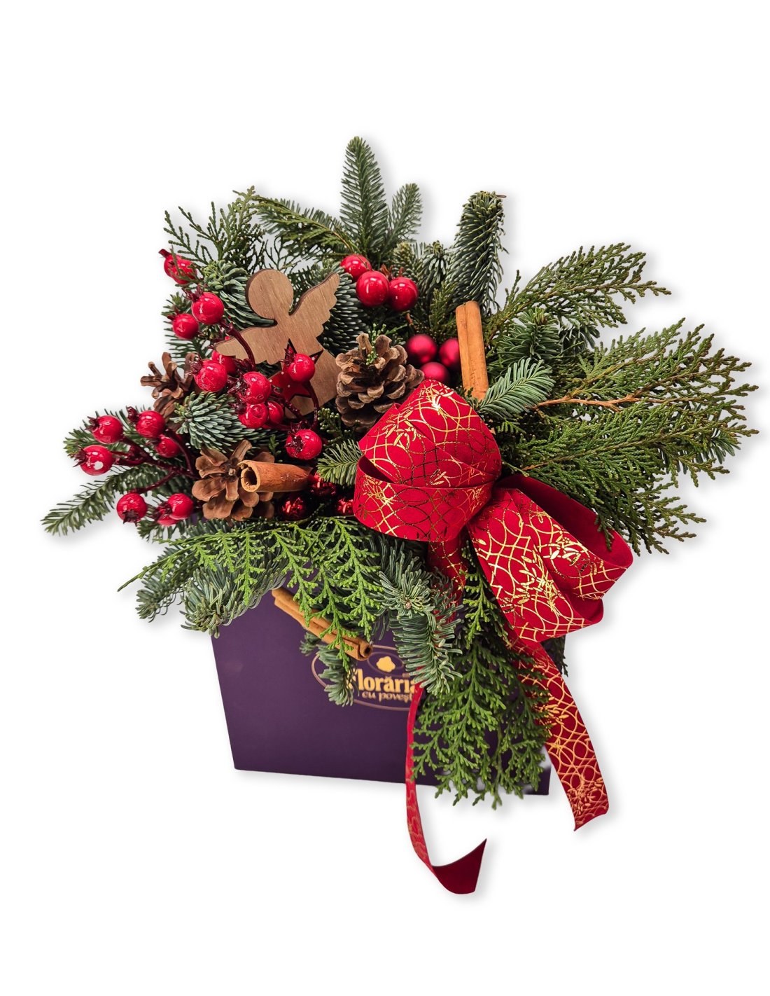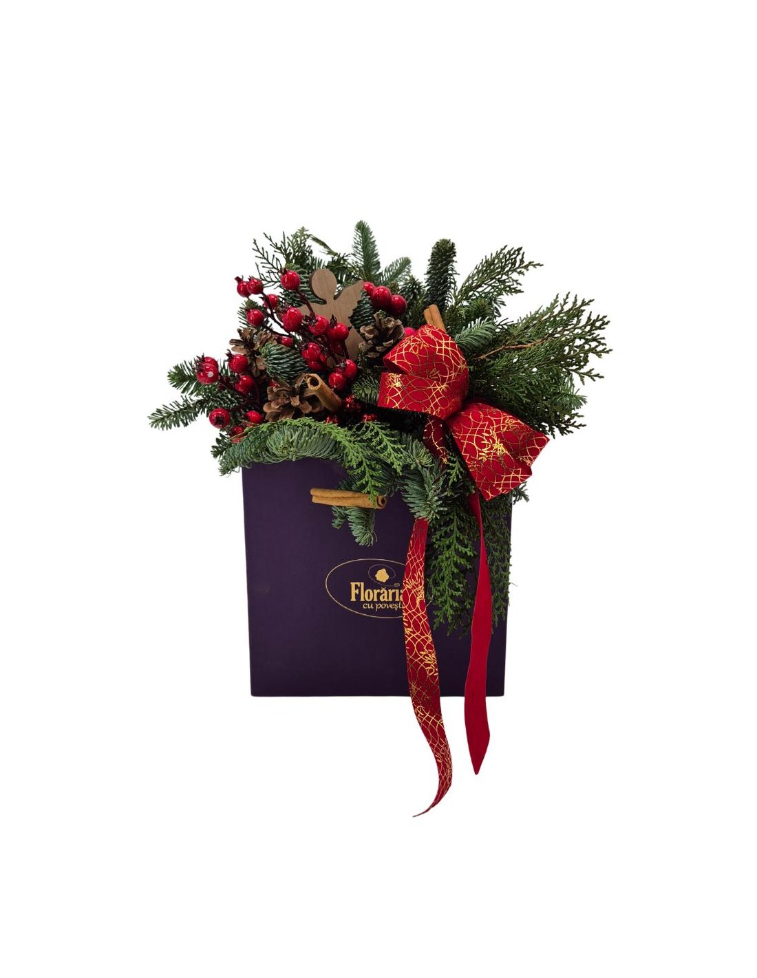 Acest aranjament floral rafinat, prezentat într-o cutie elegantă de culoare mov intens , cu sigla aurie "Florăria cu povești", surprinde esența magică a sărbătorilor de iarnă.