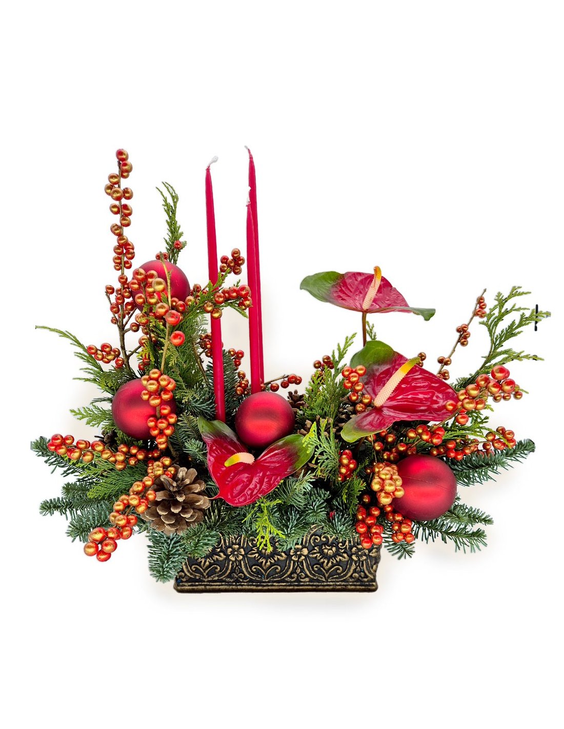 Aranjament floral de sarbatori, cu anthurium rosu, ilex rosu-auriu, globuri roșii, conuri brad si 3 lumanari roșii, brad argintiu, totul montat intr-un vas dreptunghiular auriu vintage